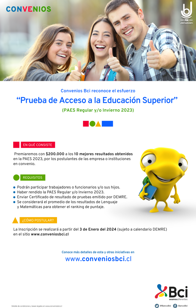 Porque BCI y Jenabien premian tu esfuerzo, nuestra empresa en convenio esta regalando $200.000 mil pesos para los 10 mejores puntaje paes 2023. Para postular debes inscribirte en su página web www.conveniosbci.cl