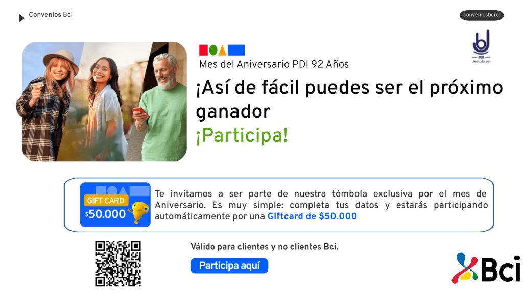 En el marco del aniversario institucional de la PDI, nuestra empresa en convenio, Banco BCI, quiere agradecer tu compromiso con un entretenido sorteo. ¡Sí, leíste bien! Uno o una de nuestros socios y socias de Jenabien podrá ganar una gift card de $50.000.