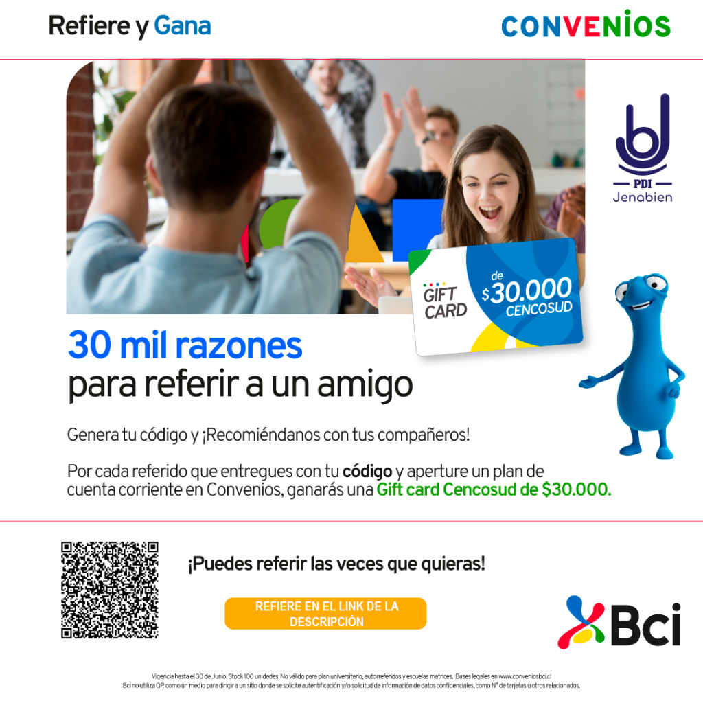 Durante junio tenemos más y más sorpresas, como este gran beneficio que nos trae nuestra empresa en convenio BCI, quienes por referir a un amigo o amiga a su banco te regalarán una gift card de $30.000 pesos.