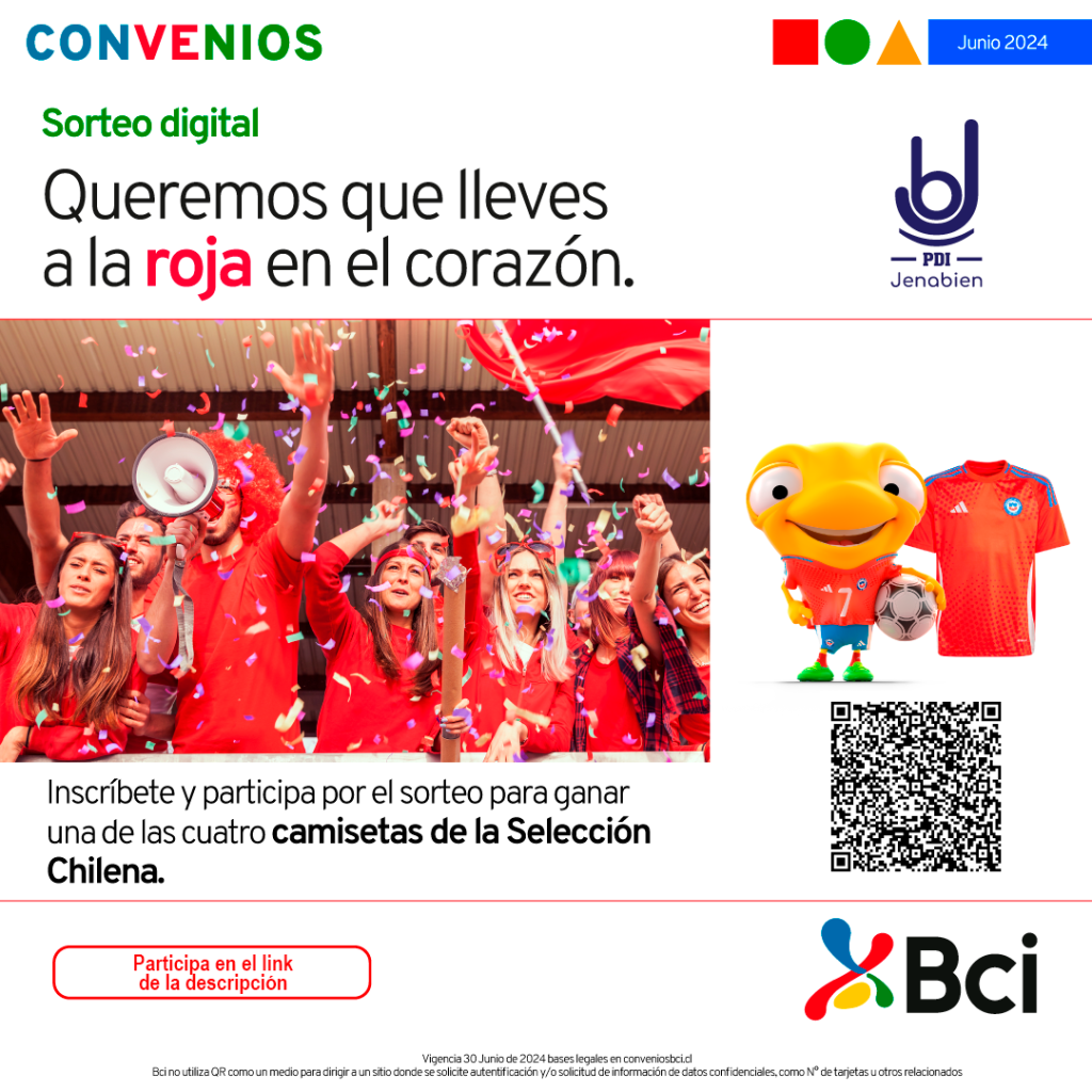 Por otro lado, BCI nos trae una tómbola especial para nuestro mes de aniversario, donde podrás ganar una de las 4 camisetas de la selección chilena.
