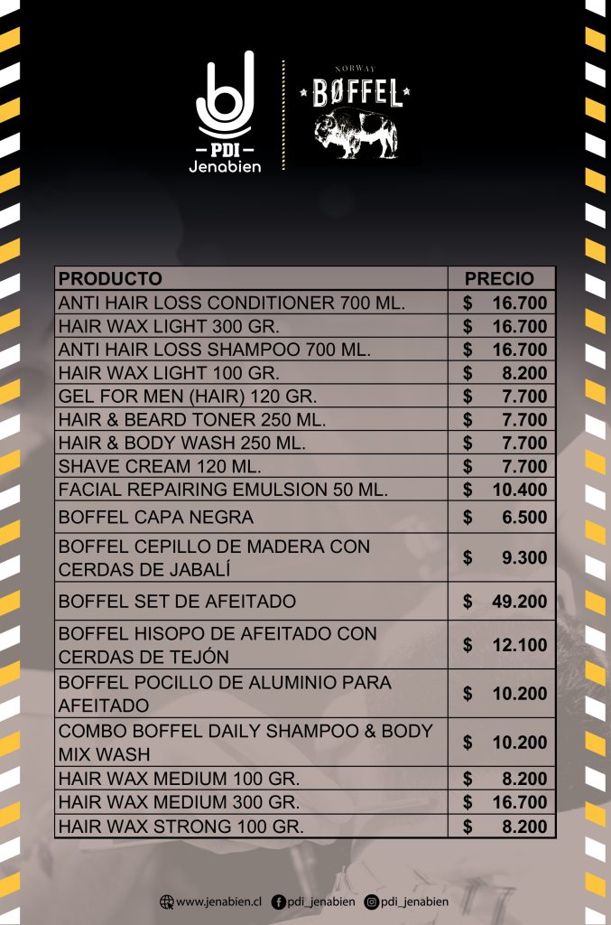 Consulta la lista de valores y productos en las imágenes adjuntas y no dudes en preguntar por el stock en tu centro de estética policial más cercano. ¡Descubre lo mejor con Boffel en Jenabien y dale a tu cabello y barba el cuidado que se merecen! 🧔✂️💈