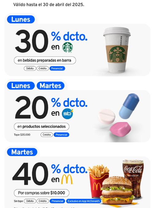 Grandes descuentos en marcas líderes Además, BCI te acerca a tus marcas favoritas con increíbles descuentos en empresas asociadas como Starbucks, Salcobrand, McDonald’s ¡y muchas más! Es la oportunidad perfecta para disfrutar de tus productos favoritos mientras ahorras.