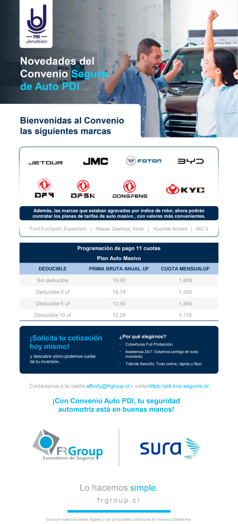 Pensando en nuestros socios y socias, hemos actualizado el Convenio Seguro Auto PDI con la alianza Fr Group y Sura, incorporando 8 nuevas marcas y, en el caso de aquellas catalogadas como complejas por robo pasaron al Plan Masivo, a un costo más accesible y con mejor cobertura. Estas últimas son: Ford EcoSport, Expedition- Nissan Qashqai, Xtrail – Hyundai Accent – MG 3.