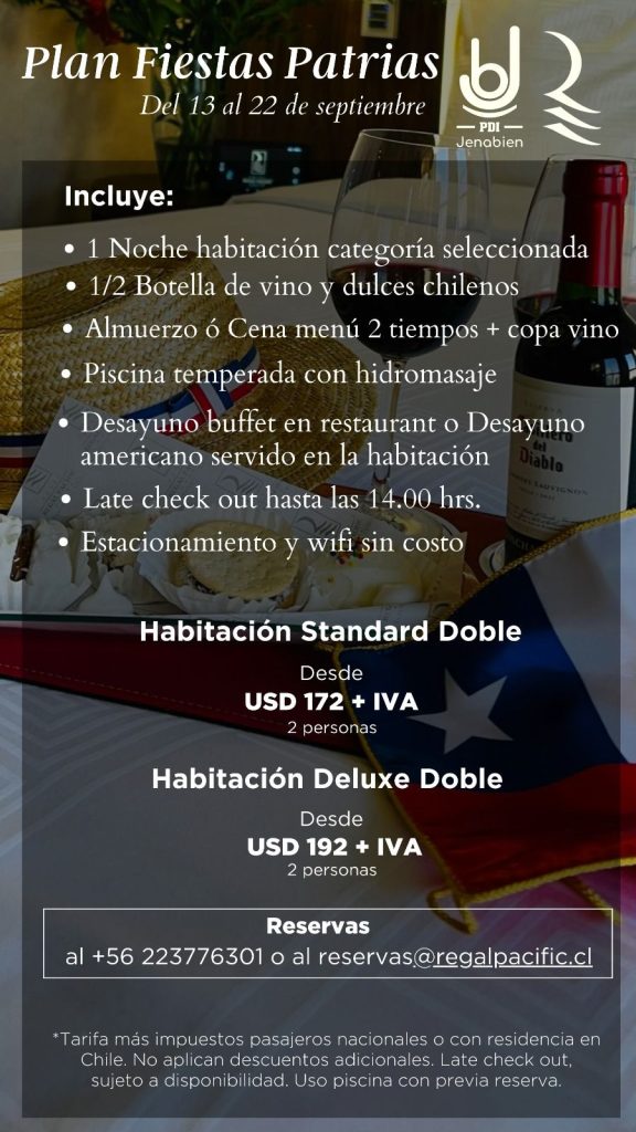 Este Dieciocho, el Hotel Regal te invita a celebrar con comodidad y lujo. Gracias a nuestro convenio especial, los socios de Jenabien podrán acceder a promociones exclusivas en habitaciones estándar doble y deluxe doble desde el 13 hasta el 22 de septiembre.