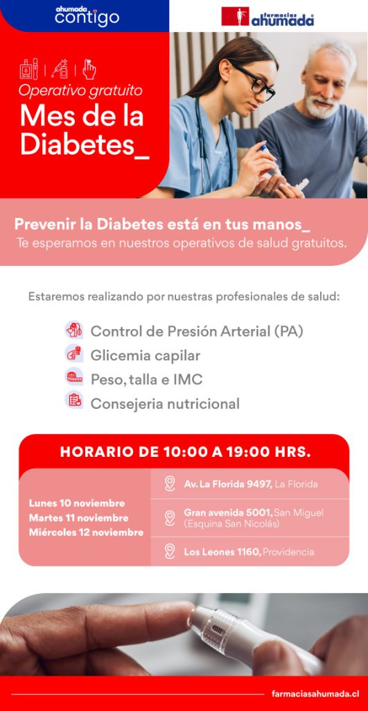 Atención socios y socias: En el marco del mes de concientización sobre la Diabetes, nuestra empresa en convenio, Farmacias Ahumada, invita a participar en un operativo de salud gratuito, especialmente diseñado para promover el autocuidado y la prevención.