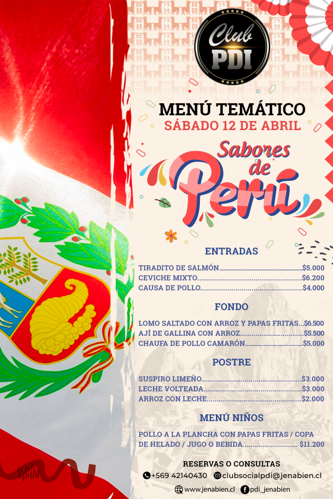 Este sábado 12 de abril, en el Club PDI inauguramos nuestros días temáticos con un espectacular menú peruano que promete deleitar a nuestros asistentes con los mejores sabores del país andino. No puedes perderte esta experiencia única, diseñada para complacer todos los gustos.