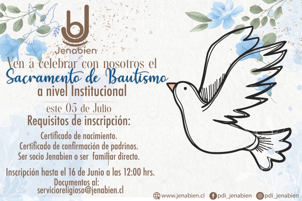 El servicio religioso de Jenabien invita a todos quienes deseen recibir el sacramento del bautizo a participar en esta especial celebración, que se llevará a cabo el próximo 5 de julio en las dependencias de la Escuela de Investigaciones.