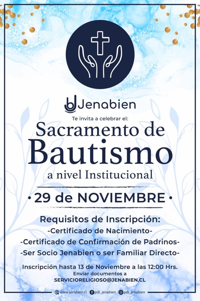 El servicio religioso de Jenabien invita a todos quienes deseen recibir el sacramento del bautizo a participar en esta especial celebración, que se llevará a cabo el próximo 29 de noviembre en las dependencias de la Escuela de Investigaciones.