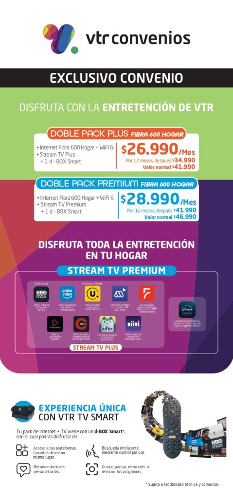 Gracias al convenio exclusivo entre Jenabien y VTR, nuestros socios y socias ahora pueden acceder a dos increíbles promociones que combinan conectividad de alta velocidad y entretenimiento de primer nivel, a precios preferenciales.