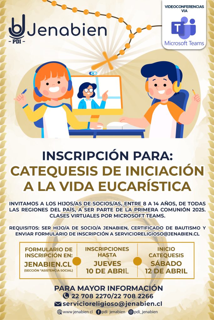 Uno de los beneficios más solicitados y mejor valorados de la Jenabien son las catequesis de preparación para el Sacramento de la Iniciación a la Vida Eucarística, Primera Comunión. Es por esto que invitamos a todos nuestros socios y socias a inscribir a sus hijos e hijas en este proceso. Las jornadas darán inicio el 12 de abril de 2025 y se desarrollará en modalidad virtual mediante la plataforma Teams.