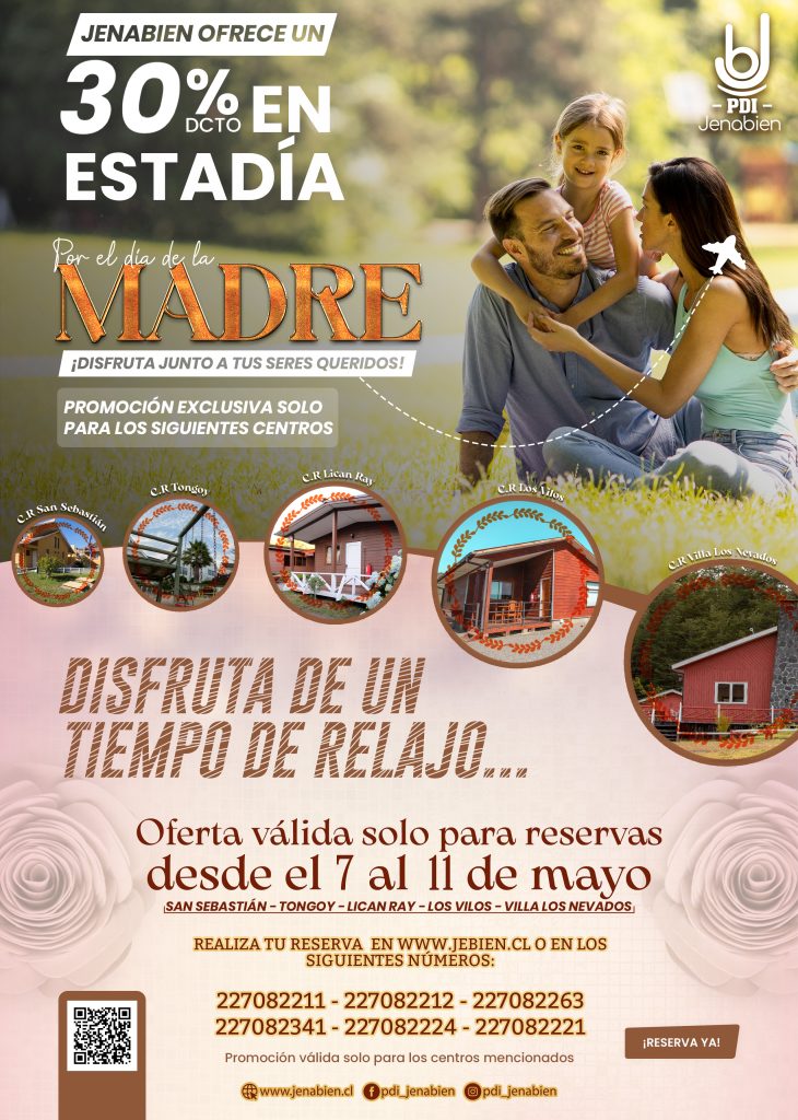 Esta semana, en honor al Día de las Madres, Jenabien ofrece un 30% de descuento en reservas para sus centros ubicados en San Sebastián, Tongoy, Lican Ray, Los Vilos y Villa Los Nevados.