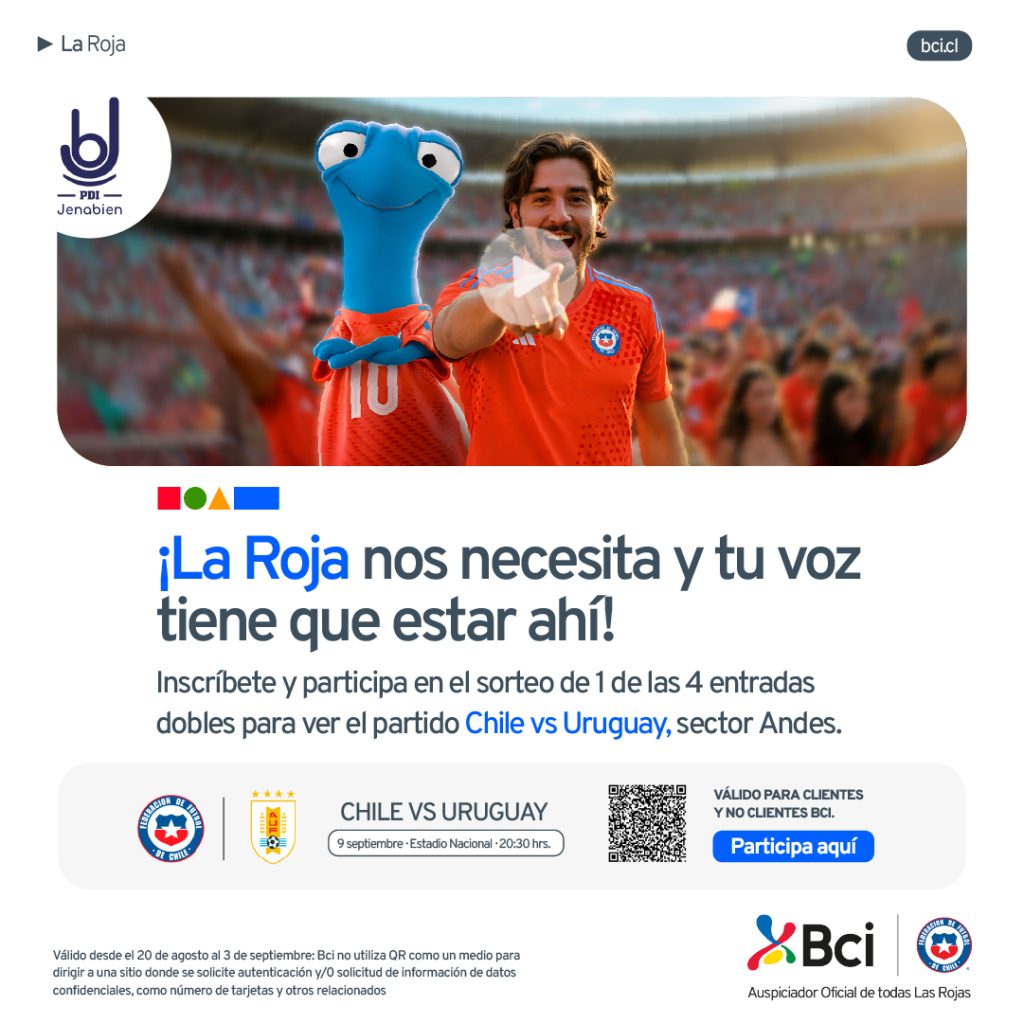 Nuestra selección chilena nos necesita, y tú puedes estar ahí para apoyarla. Gracias a nuestro convenio con BCI, estamos sorteando 4 entradas dobles para el esperado partido Chile vs Uruguay, en el sector Andes del estadio.