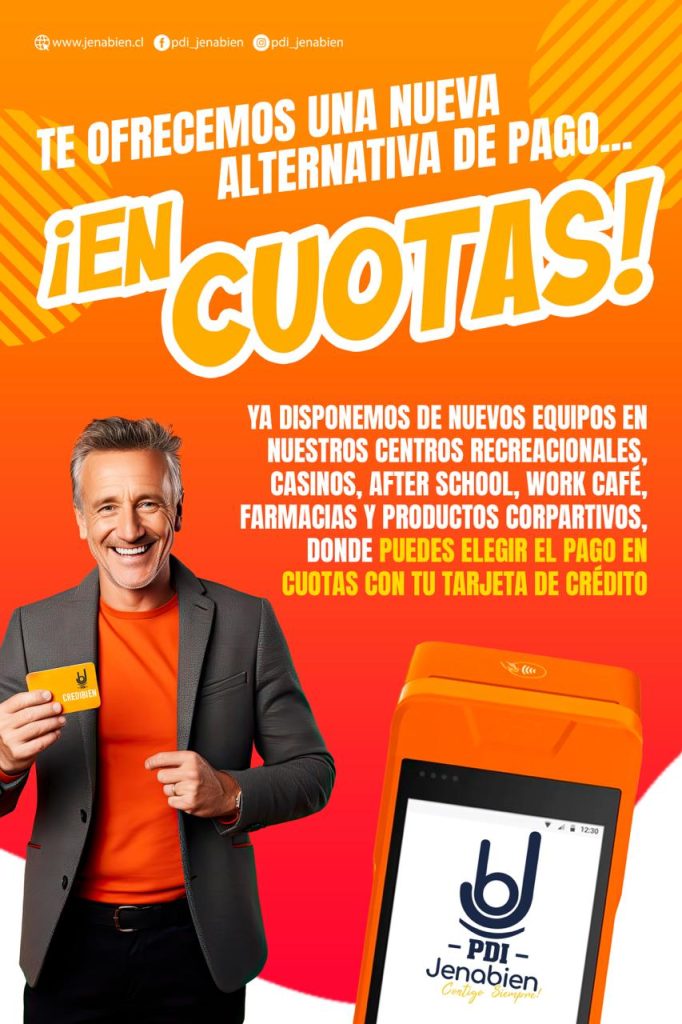 Finalmente, otro servicio de Jenabien donde podrán utilizar este nuevo sistema de crédito es el After School PDI, el cual tiene como meta principal ser un espacio seguro que cuide a los hijos e hijas de nuestros socios. Contamos con tres jornadas, mañana, tarde y completa. Recuerda que también activamos el pase diario para que lleves a tus niños el día que necesites.