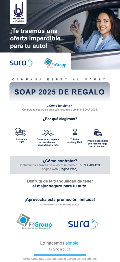 En colaboración con Sura, Jenabien trae una oportunidad única para todos los conductores que buscan tranquilidad al volante. ¡Este 2025 empieza con el pie derecho! Al contratar tu seguro de autos con Sura, recibirás como regalo el SOAP 2025, indispensable para circular sin preocupaciones por las carreteras de nuestro país.