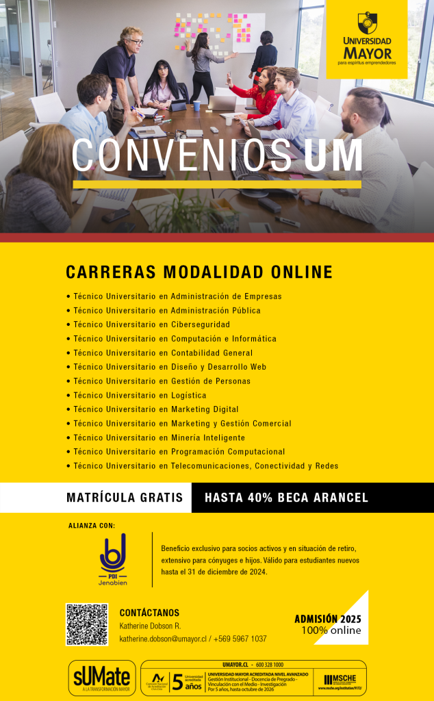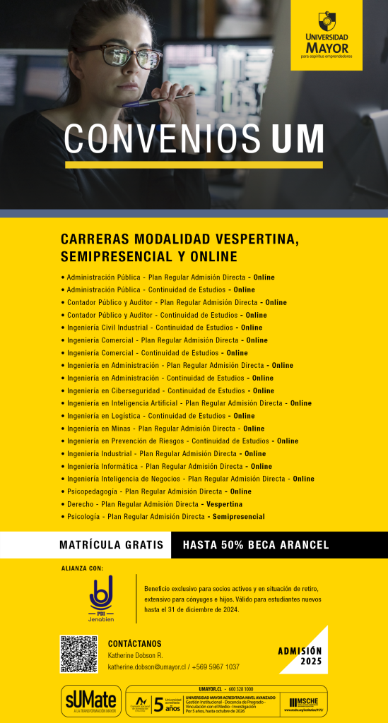 Jenabien en colaboración con Universidad Mayor, tienen emocionantes novedades para la admisión 2025. Ahora puedes optar por nuevas carreras online que se adaptan a tus necesidades y horarios. Además, los programas de postgrado ya están habilitados para postular, ofreciendo una amplia gama de oportunidades para tu desarrollo profesional.