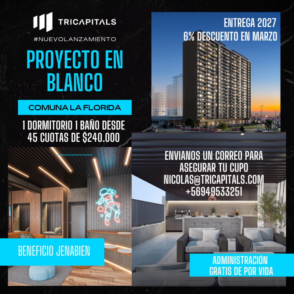 ¿Buscas un lugar ideal para tener tu espacio personal? Tricapitals, nuestra empresa en convenio, tiene la solución, ya que está ofreciendo un 6% de descuento exclusivo para los socios y socias Jenabien en su nuevo proyecto en blanco ubicado en la comuna de Florida.