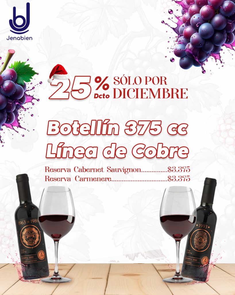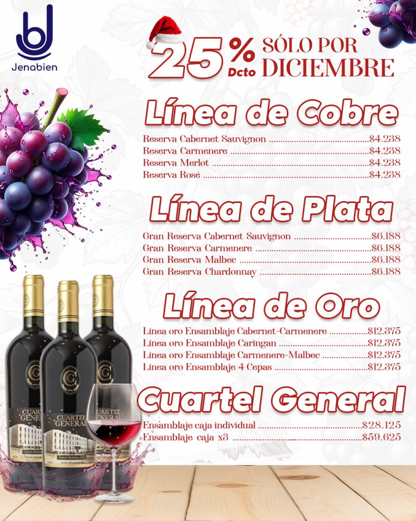 La Navidad ya está aquí y con ella llega el espíritu festivo, la alegría de compartir y la tradición de reunirnos en torno a la mesa. En Corporativo Jenabien queremos ser parte de esos momentos únicos y por eso hemos preparado una promoción especial que hará brillar tus celebraciones: toda nuestra línea de vinos, sangría y espumantes cuenta con un 25% de descuento durante este mes.