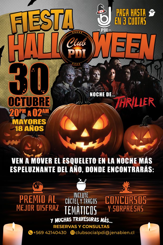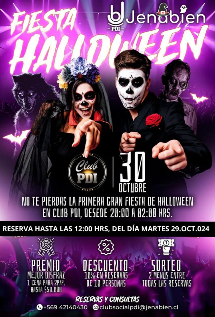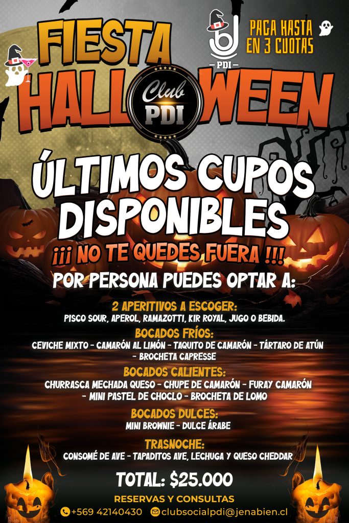 ¡Te esperamos para una noche llena de miedo y diversión en el Club PDI! Reservas al 📞+56 9 42140430 – 📬️ clubsocialpdi@jenabien.cl